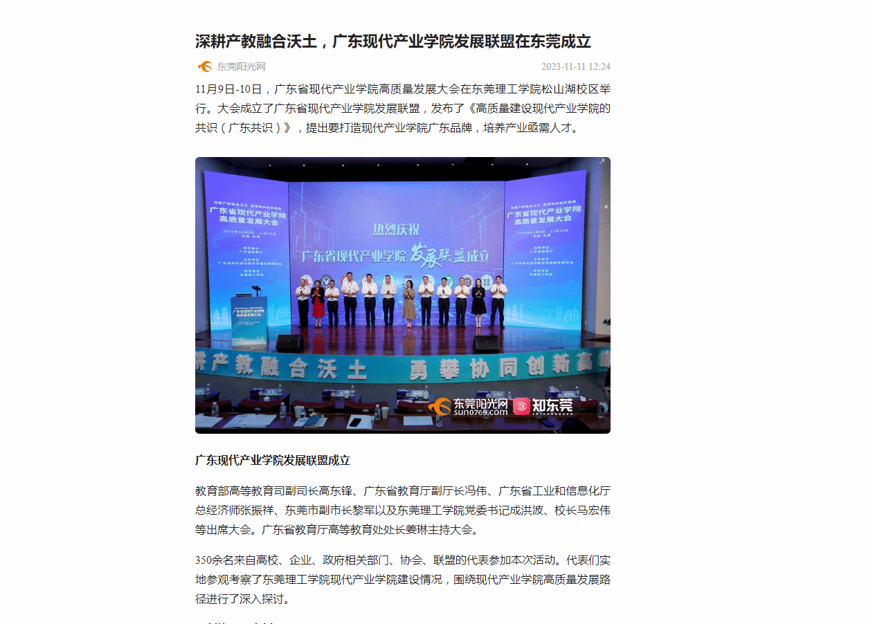 11月9日-10日,广东省现代产业学院高质量发展大会在九九精品视频一区在线久久久久久久久久毛片精品美女|国产99久久久久久免费看|中文精品99久久国产|国产69精品久久久久9999|精品久久久久久中文字幕无码|亚洲熟妇无码久久精品国产精品99|精品国产天堂综合一区在线松山湖校区举行。大会成立了广东省现代产业学院发展联盟,发布了《高质量建设现代产业学院的共识(广东共识)》,提出要打造现代产业学院广东品牌,培养产业亟需人才。