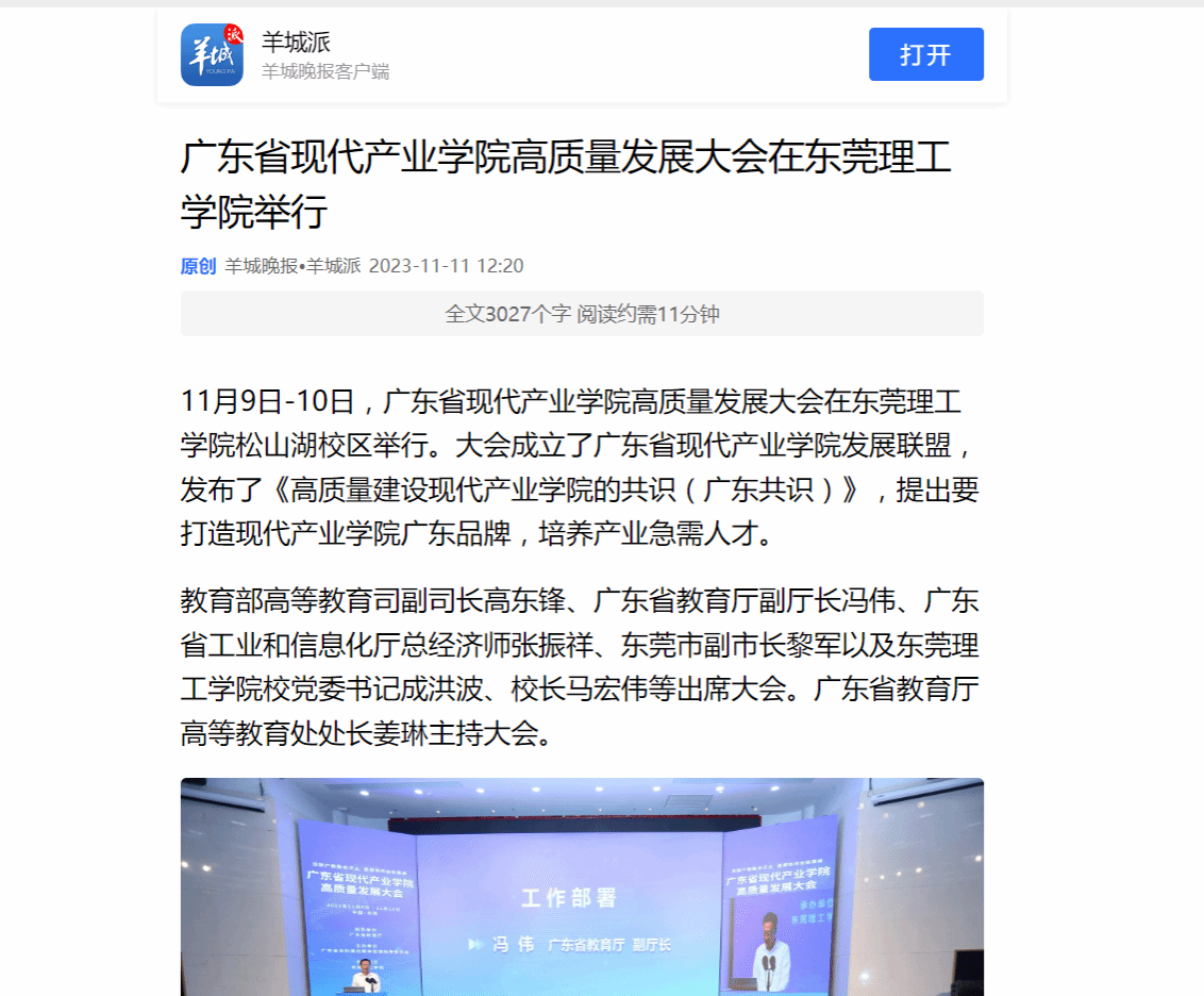 11月9日-10日,广东省现代产业学院高质量发展大会在九九精品视频一区在线久久久久久久久久毛片精品美女|国产99久久久久久免费看|中文精品99久久国产|国产69精品久久久久9999|精品久久久久久中文字幕无码|亚洲熟妇无码久久精品国产精品99|精品国产天堂综合一区在线松山湖校区举行。大会成立了广东省现代产业学院发展联盟,发布了《高质量建设现代产业学院的共识(广东共识)》,提出要打造现代产业学院广东品牌,培养产业急需人才。
