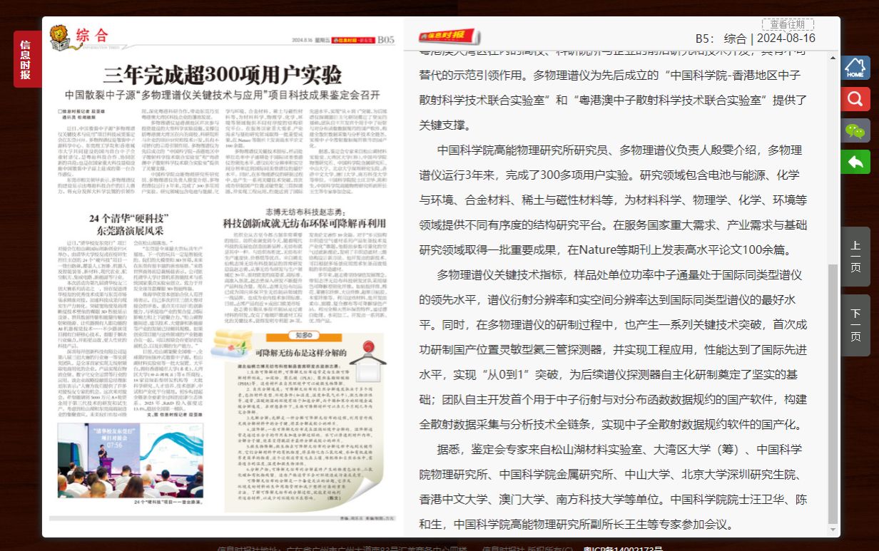 多物理谱仪是港澳地区首次参与投资建设的大型科学实验设施,支撑包括粤港澳大湾区在内的高校、科研院所与企业的前沿研究和技术开发,具有不可替代的示范引领作用。多物理谱仪为先后成立的“中国科学院-香港地区中子散射科学技术联合实验室”和“粤港澳中子散射科学技术联合实验室”提供了关键支撑。