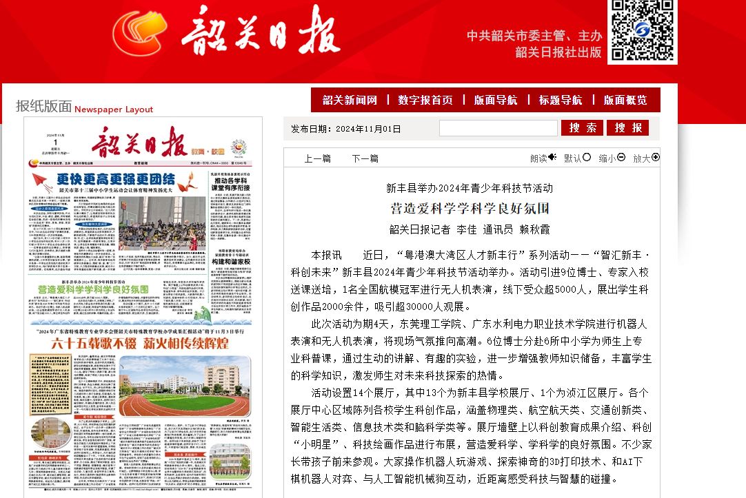 本报讯 近日,“粤港澳大湾区人才新丰行”系列活动——“智汇新丰·科创未来”新丰县2024年青少年科技节活动举办。活动引进9位博士、专家入校送课送培,1名全国航模冠军进行无人机表演,线下受众超5000人,展出学生科创作品2000余件,吸引超30000人观展。