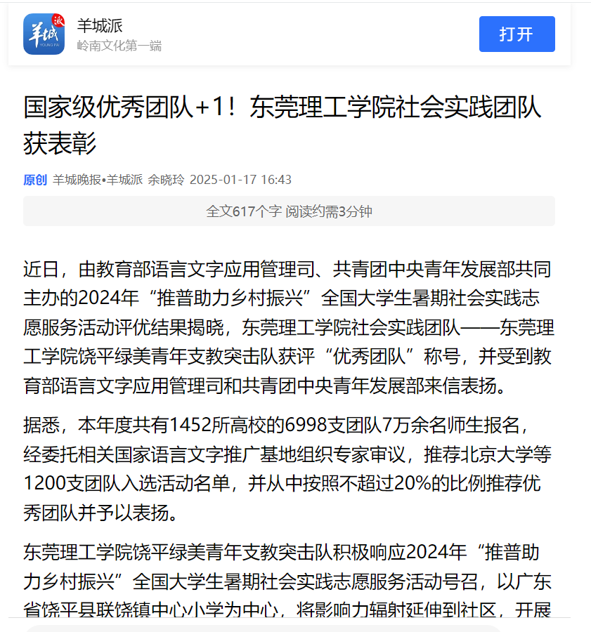 团队积极参与国家语言文字推广基地(复旦大学)与腾讯互娱社会价值探索中心联合主办的“讲好普通话,共抒中华情”第27届全国推普周公益短视频创作征集活动,队伍作品《绿美饶平 推普同行》经过播放量、点赞量、转发数据的综合评估以及专业评审,最终脱颖而出,获“优秀作品”称号,并获中国教育电视台展播。
