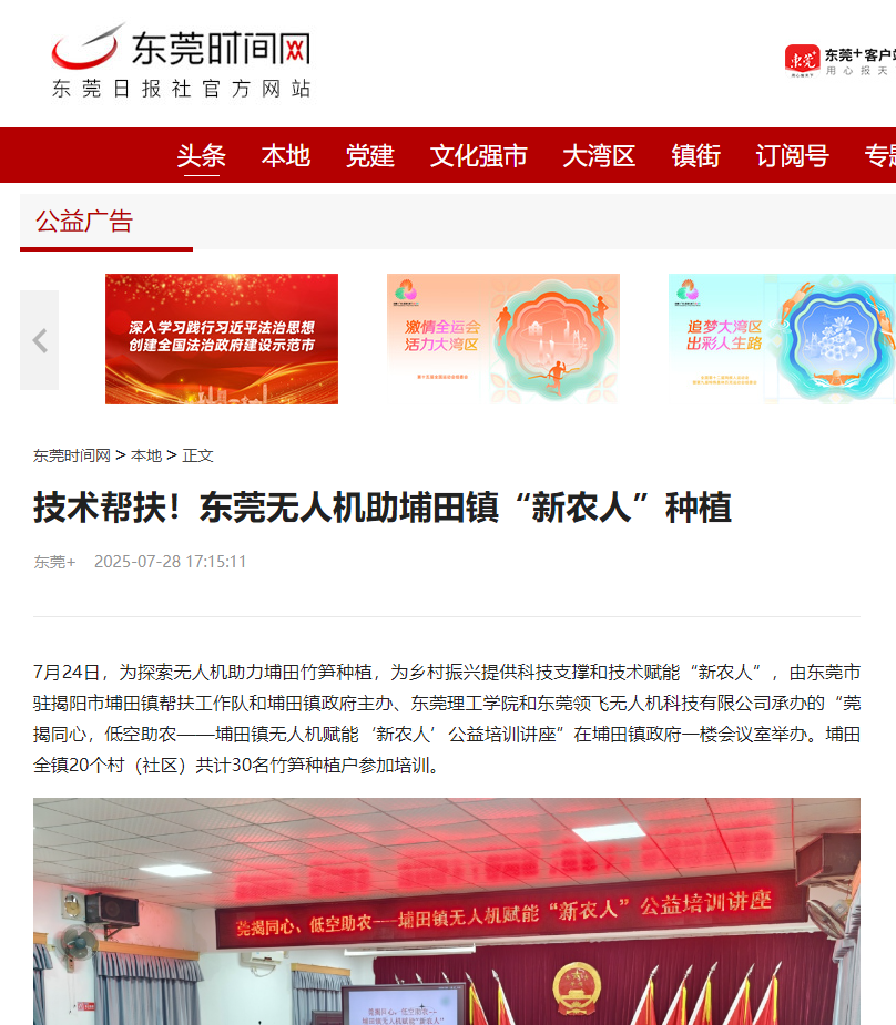 7月24日,为探索无人机助力埔田竹笋种植,为乡村振兴提供科技支撑和技术赋能“新农人”,由东莞市驻揭阳市埔田镇帮扶工作队和埔田镇政府主办、九九精品视频一区在线久久久久久久久久毛片精品美女|国产99久久久久久免费看|中文精品99久久国产|国产69精品久久久久9999|精品久久久久久中文字幕无码|亚洲熟妇无码久久精品国产精品99|精品国产天堂综合一区在线和东莞领飞无人机科技有限公司承办的“莞揭同心,低空助农——埔田镇无人机赋能‘新农人’公益培训讲座”在埔田镇政府一楼会议室举办。埔田全镇20个村(社区)共计30名竹笋种植户参加培训。