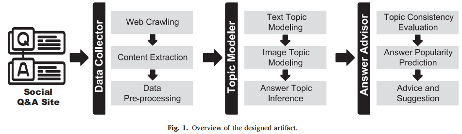 该研究提出一种预测问答社区答案喜爱度的工具,此工具特别强调将图文连贯性作为答案质量的指标。研究团队采用设计科学研究开发了一个答案顾问(简称AA)来预测其他用户对答案的喜爱程度。这种预测依赖于答案中图像和文本主题分布之间的一致性,并且该预测在答案实际发布在问答网站之前即可做出。为了实现这一点,研究团队首先扩展了经典的文本主题模型,训练了一个深度主题模型,该模型利用在高度喜欢的答案中发现的文本和图像之间的对齐模式,使本研究能够同时推断新答案中的文本主题分布和图像主题分布。研究团队分别对文本和图像的两种分布进行了散度测量,可以计算出新答案的图像-文本语义连贯水平。最后,将图像-文本语义一致性纳入AA中,以预测答案可能获得的赞成票的数量,从而提供对答案质量的评估。在真实数据集上的实验结果表明,图像和文本的连贯性与用户的回答所获得的点赞数量呈正相关。此外,与传统的文本和图像特征相比,在引入所提出的图像-文本语义一致性度量后,AA的预测精度可以提高38.12%,将解释能力从0.14提高到0.47。